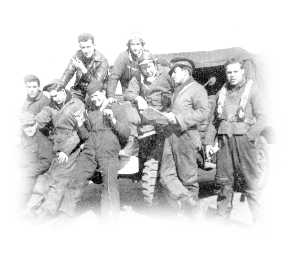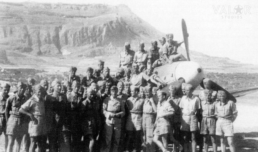 Squadron Six (6./JG-27) at Trapani-Milo airfield in Sicily. Mount Erice looms behind them. Franz Stigler is to the immediate right of Willy Kientsch who stands with his hands together at center (courtesy of John Weal).