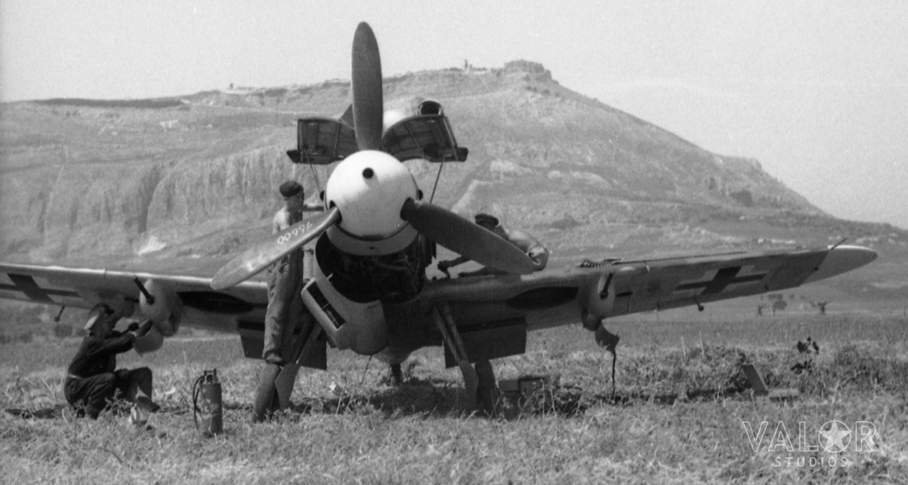 A JG-27 Bf-109 receive the attention of the ground crew. Note Venus Castle on top of Mount Erice.