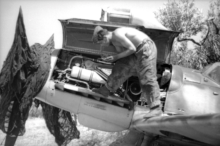 A Luftwaffe mechanic works on the engine of a JG-27 Bf-109 fighter