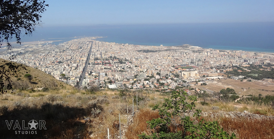Looking west past Venus Castle. The city of Trapani can be seen in the lower left.