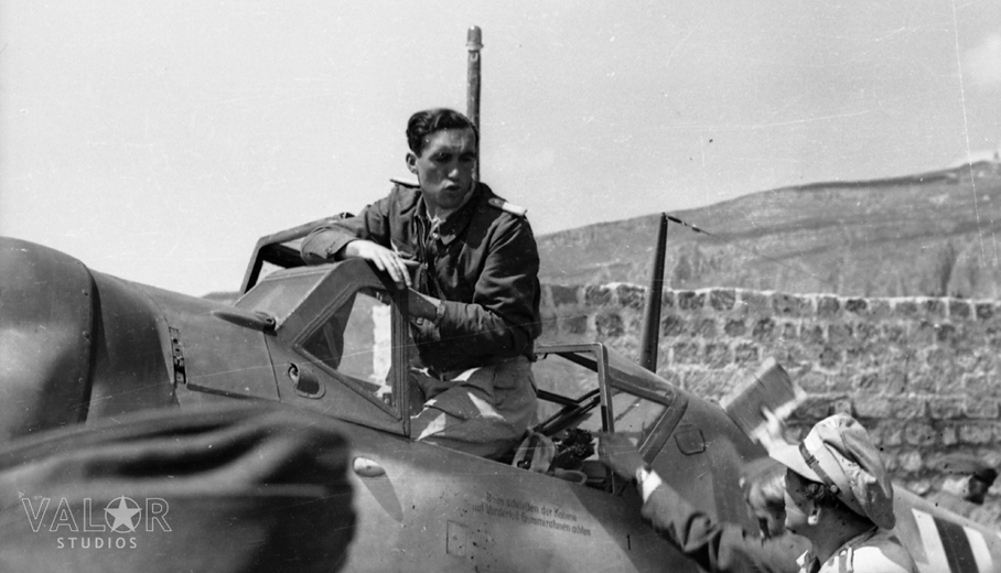 Willy Kientsch emerges from his Bf-109 after a mission. A brick reventment protects his plane.